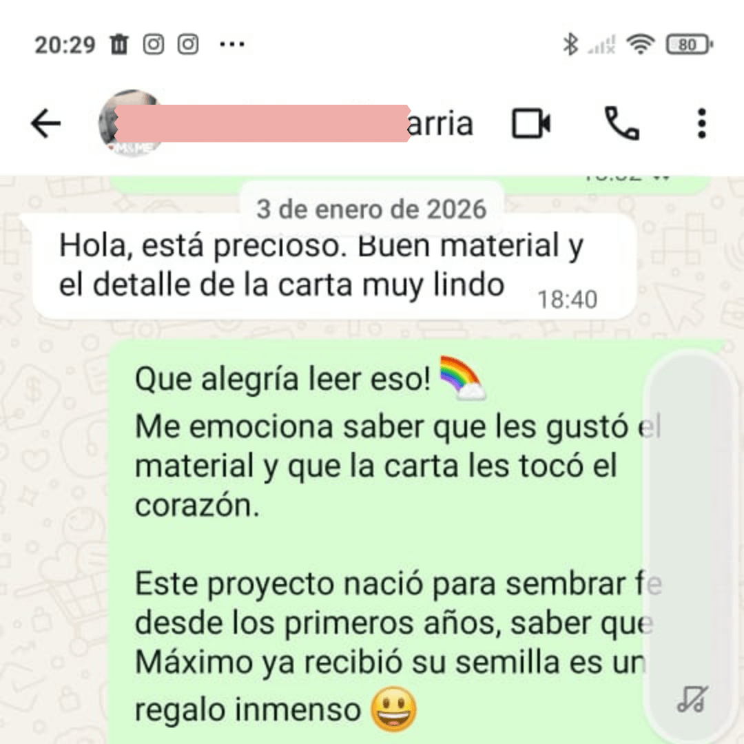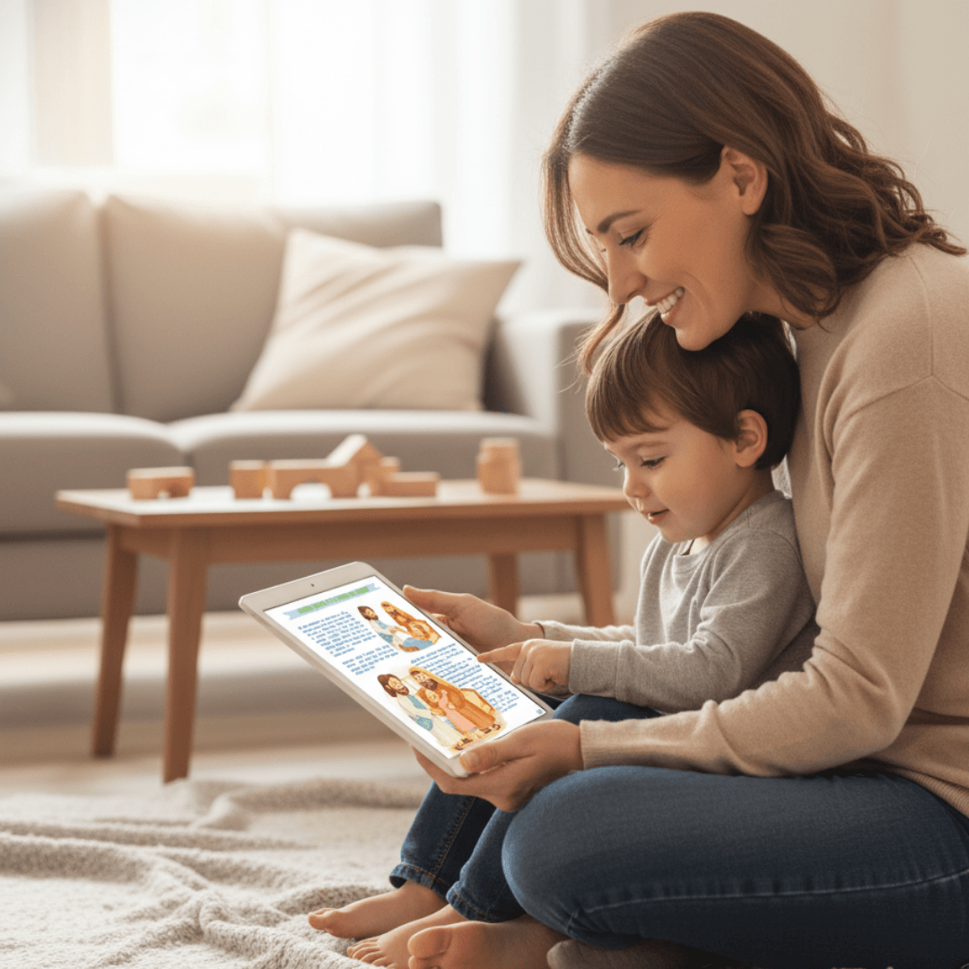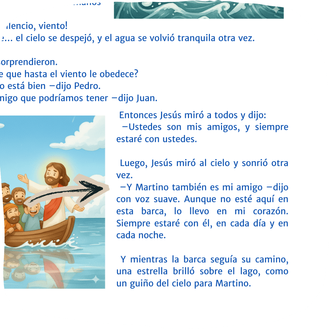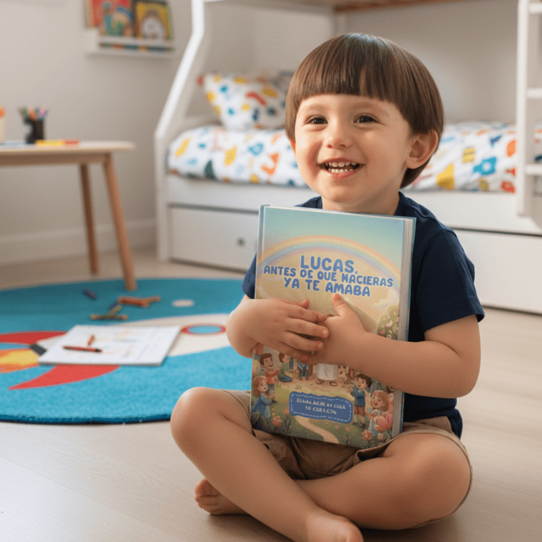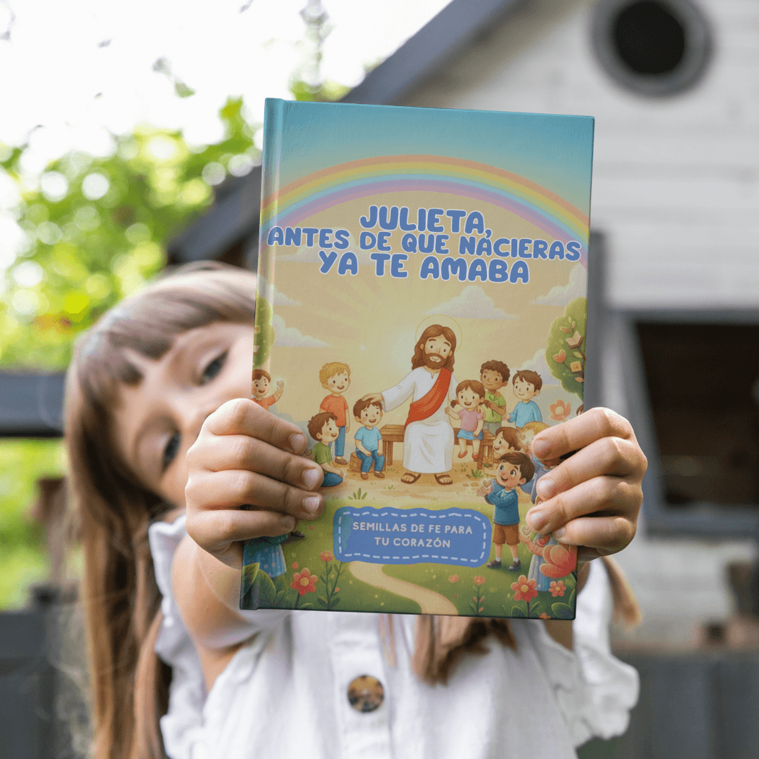 Al reservar tu cupo, nos indicas el nombre de tu hijo/a. Ese nombre se incluye en la portada y dentro de cada cuento, haciendo que Jesús le hable directamente en las historias.