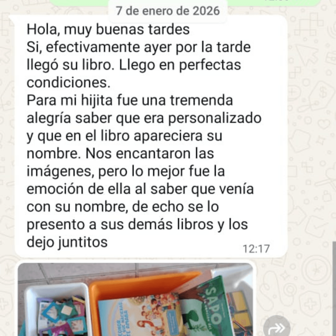 Cada libro es creado de manera personalizada con el nombre de tu hijo/a, por lo que no es posible aceptar devoluciones ni cambios una vez entregado. Sin embargo, nos comprometemos a que el resultado cumpla con lo prometido y llegue en perfectas condiciones. Si hubiera algún problema en el envío, nos haremos cargo de solucionarlo.